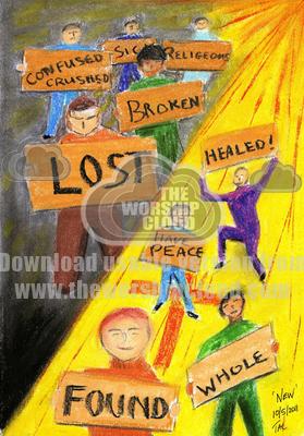The images is based on the contrast in the beatitudes in Matthew 5, illustrated in the difference that salvation brings through faith in Christ.