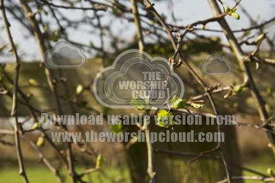 Fresh new leaves springing forth on a hawthorn bush with a withered berry still hanging on in contrast.