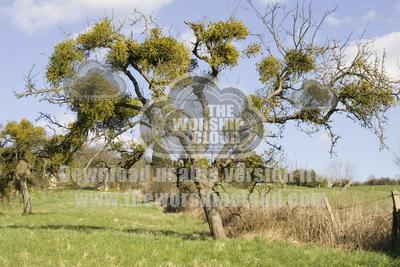 Old apple tree covered in parasitic European mistletoe Viscum album Cotswolds UK