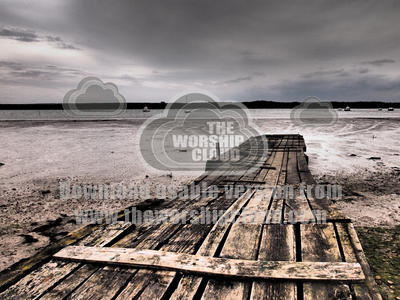 Chromatic image of an old wooden jetty projecting over mud with water in the near distance