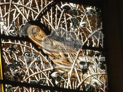 Stained glass image showing a statue of the Virgin Mary hidden by brambles.