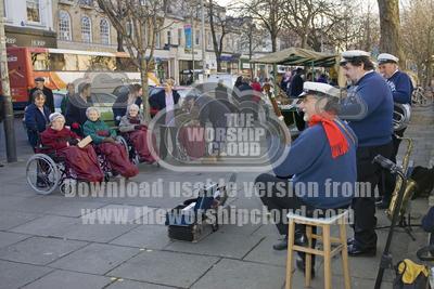 Paragon New orleans Jazz Band playing to disabled shoppers at Christmas on Cheltenham Promenade, UK