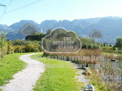 Small winding footpath in Austria - Pond and bullrushes.