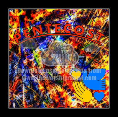 A colourful background with the word "Pentecost" and the symbols of a hand, heart, and a dove.