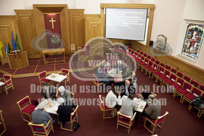 People sitting in groups at cafe church evening Bethodist Methodist church Cheltenham UK