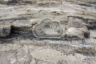 Piece of fossilised tree trunk in exposed rocks on beach of Curio Bay site of fossil forest in the Catlins coast south-eastern Southland New Zealand. The fossilised trees date back to the middle Jurassic and are found mainly in green sandstone where the wood has been replaced by silica making the fossils resistant to erosion.