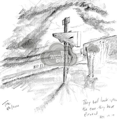 The image is drawn from a perspective that is the same hight as the cross and sees the cross from a side on perspective which implies that the observeris one of the two theives. The question is which one?