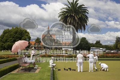 Playing bowls in Government Gardens outside Rotorua Museum , Rotorua, North Island, New Zealand