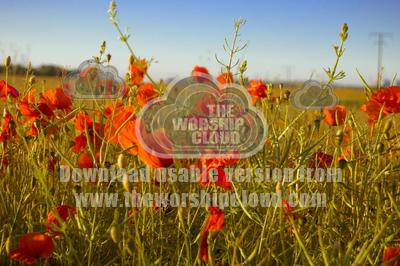 A view of a poppy field, with a close-up of several poppies in the foreground.