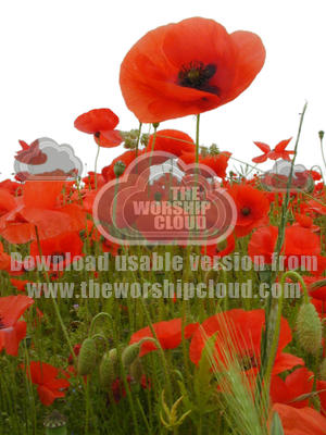 Red poppies with a white background amidst a field of still green barley