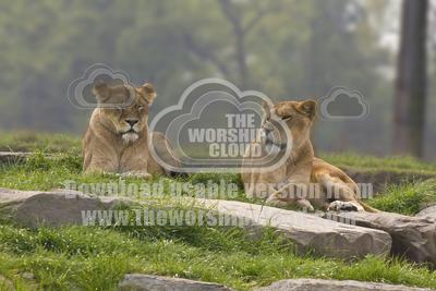A pair of lovely, sleepy lionesses resting on a fine sunny day