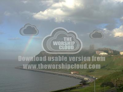 A rainbow at the edge of the cliff between the bays in scarborough. The castle is lost in mist.