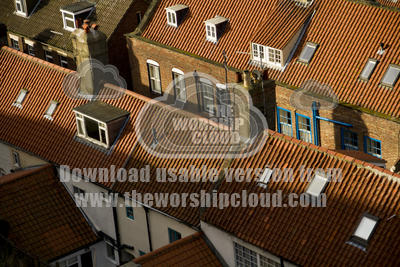 Overhead view of a row of red roofed cottages at the lovely resort of Whitby