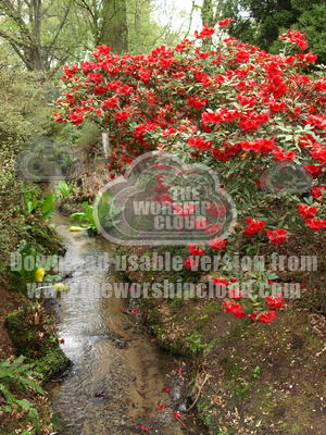 Red azelea beside stream.