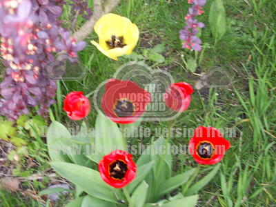 Tulips in red with one yellow bloom as contrast flowering late April early May. Photograph on digital camera.By Audrey hogan