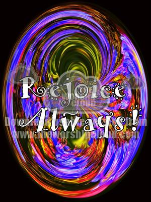 A bright swirling background with the words "Rejoice always"