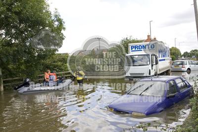 Rescue workers taking people in inflatable dingy along fooded in Newtown surround by partly submerged cars and lorries Tewkesbury Gloucestershire UK following unprecedented flooding of Rivons Avon and Severn above 1947 level