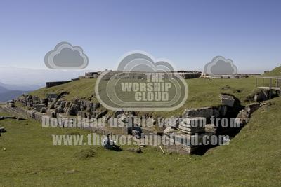 Researcher at Gallo-Roman temple of Mercury with observatory behind meterological observatory on summit of Puy de Dome, Auvergne mountains, Central France Run by the University Blaise Pascal the Observatoire de Physique du Globe records weather data and carries out climate research.