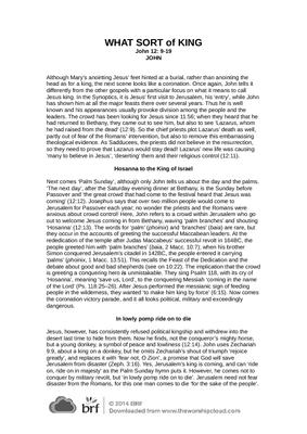 Although Mary’s anointing Jesus’ feet hinted at a burial, rather than anointing the head as for a king, the next scene looks like a coronation. Once again, John tells it differently from the other gospels with a particular focus on what it means to call Jesus king. In the Synoptics, it is Jesus’ first visit to Jerusalem, his ‘entry’, while John has shown him at all the major feasts there over several years…