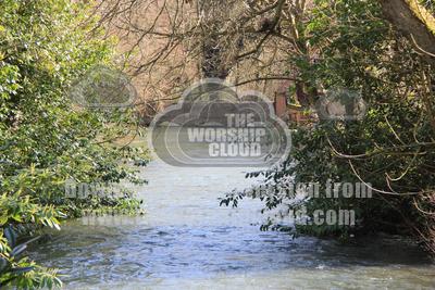 The River Lambourn at Welford, near Newbury, England, flowing strongly in Spring after much rain.