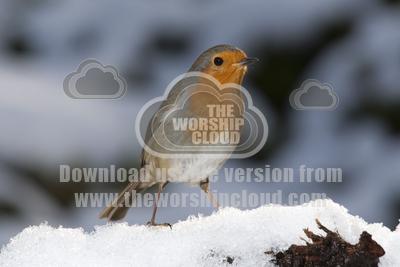 • European robin Erithacus rubecula perched on spade handle in snow Woodmancote Cotswolds UK