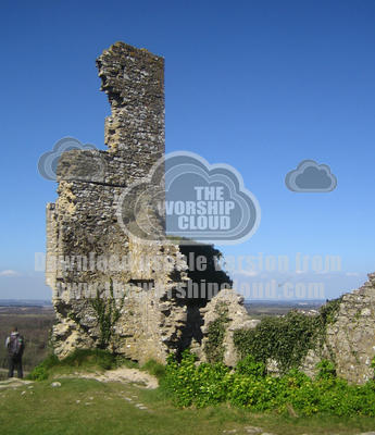 Ruined stone wall at Corfe Castle, Dorset, with walker showing scale.