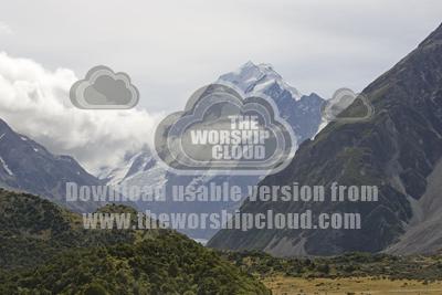 Spectacular scenery of glacial valley with snow capped mountains and forested slopes in Aoraki Mount Cook National Park. Surrounded by snow covered mountains this spectacular wilderness area in South Island New Zealand ihas now been designated a World Heritage Site.