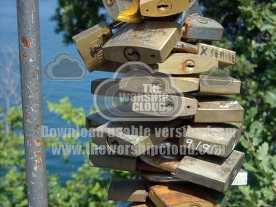 Padlocks on a railing overlooking bay of Naples