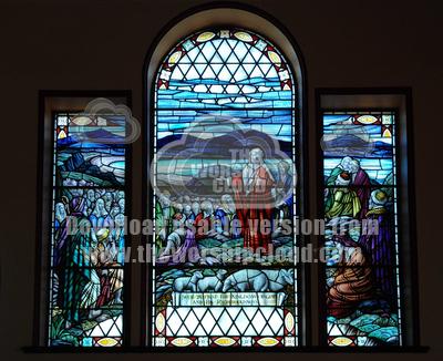Traditional stained glass window in St Johns Methodist Church Hayfield depicting Jesus delivering the sermon on the mount.
