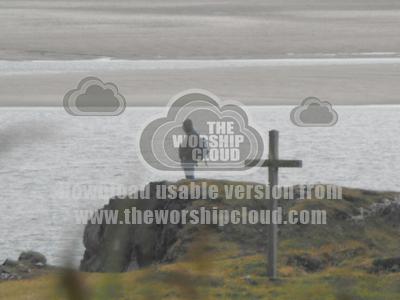 Image shows Cuthberts island with a man looking out across the waters. Has a cross in the forground and exposed sandbanks in the background
