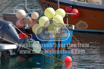 Fishing boat, with buoys, moored in Mevagissey outer harbour