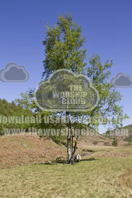 A fine sunlit Silver Birch tree with a sheep shaded beneath its newly opened leaves