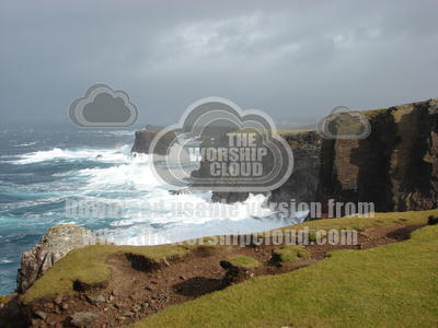 The Atlantic ocean hits the west coast of Shetland in a blaze of white surf.