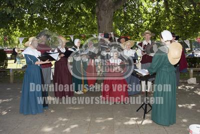 Singers in medieval costume in Bancroft Gardens near Royal Shakespeare Theatre, raising money for Leucemia Research, Stratford-upon-Avon, UK