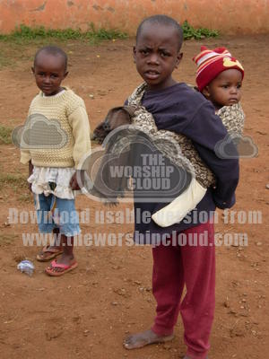 Picture of group of children in Kenya - older sister carrying younger sister on her back.