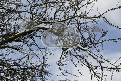 Heavy snow lying along winter bare branches on a sunny but cold day