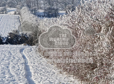 snowy landscape with hedgerows covered in frost