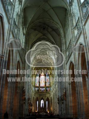 Inside view of the Cathedral of St Vitus showing tall sided walls and ceiling.