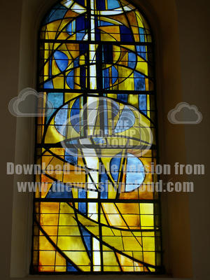 View of stain glass window in Derby Cathedral designed by Ceri Richards. All Saints and All Souls windows
