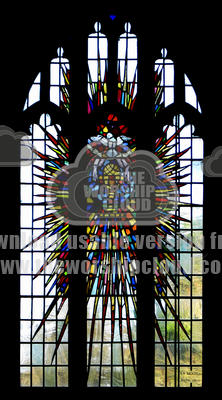 Photograph of a modern stained glass window in the Church at Cliddesden, Hampshire. it depicts the Holy Spirit in the form of a dove, hovering over a chalice.