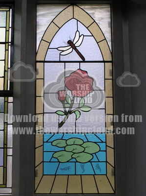 This memorial window was made by a member of our congregation and was inspired by the story 'Waterbugs and Dragonflies.'