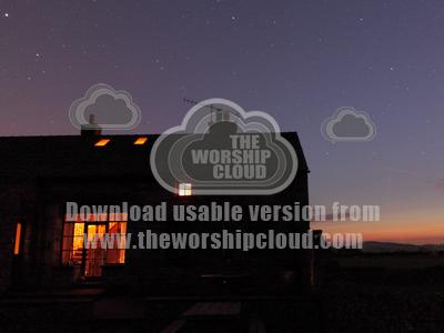 The remains of sunlight in the evening sky, with stars. Also a house with the lights on.
