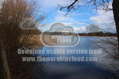A large lake with reflection of clouds and sky, surrounded by trees.