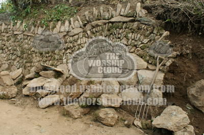 This retaining wall partially collapsed, and is shown mid repair. The stone mason improved on the original random arrangement, adding the curves.