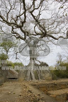 Strangling fig taking over ruined building at Gedi Ruins, Watamu, Kenya
