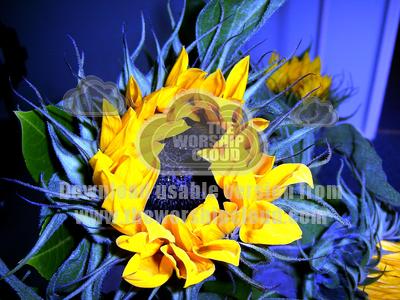 Sunflower taken on digital camera then effect added when I used my computer graphics effects. Just loved the vibrant blue ! Contrast of blue and gold. By Audrey Hogan