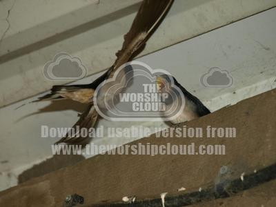 A swallow arrives as the young bird waits with mouth open