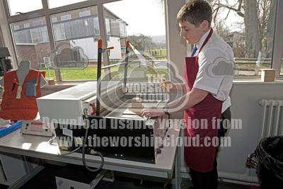 Teenage boy using pressure moulding machine Design & Technology classt Balcarras School Cheltenham UK