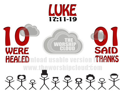 Ten stick figures - only one returned to say thanks - text from Luke 17:11-19