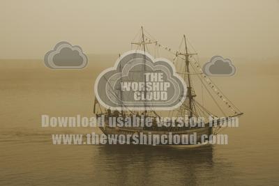 The replica of the Endeavour emerges from a thick sea fret at Whitby